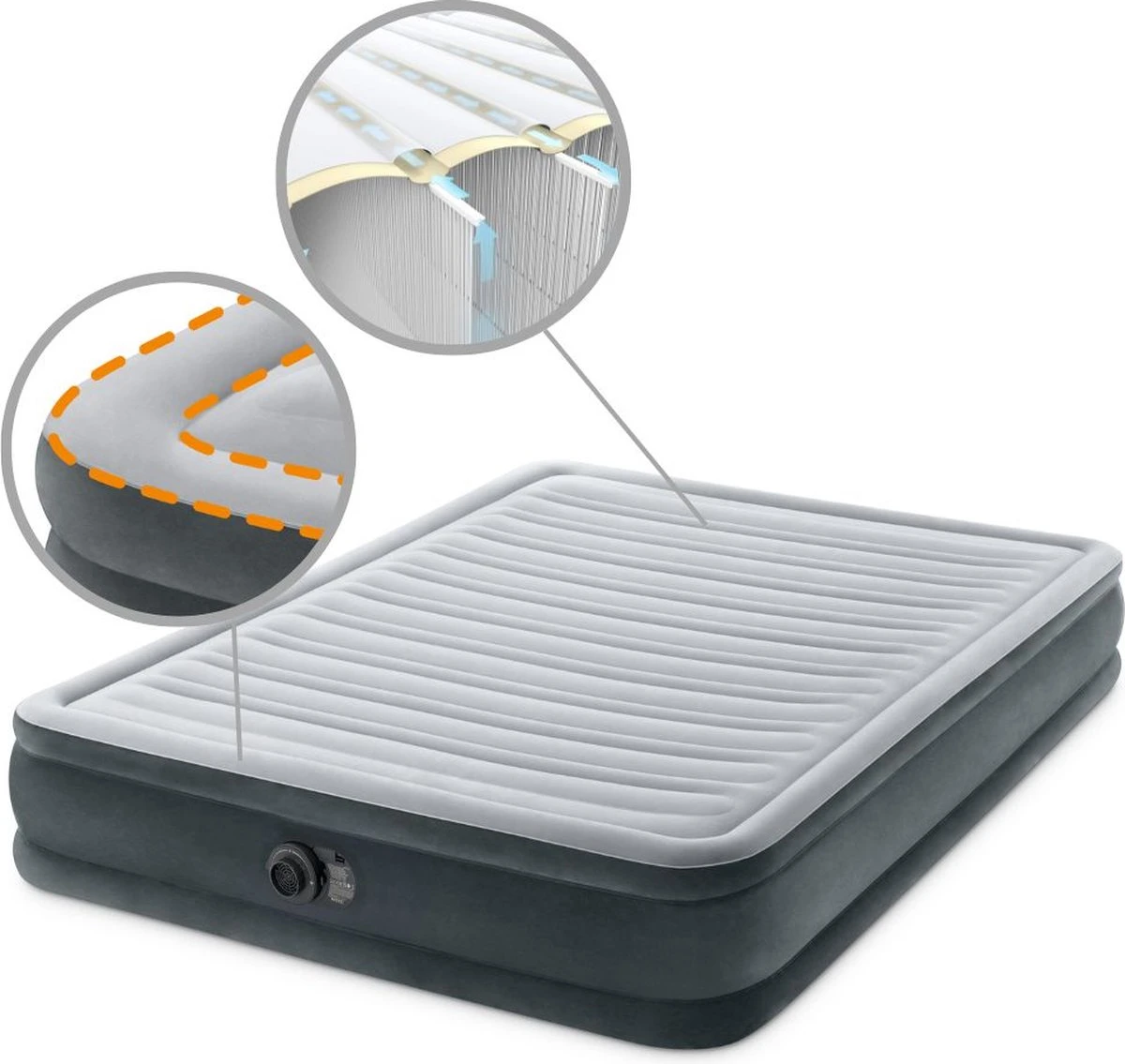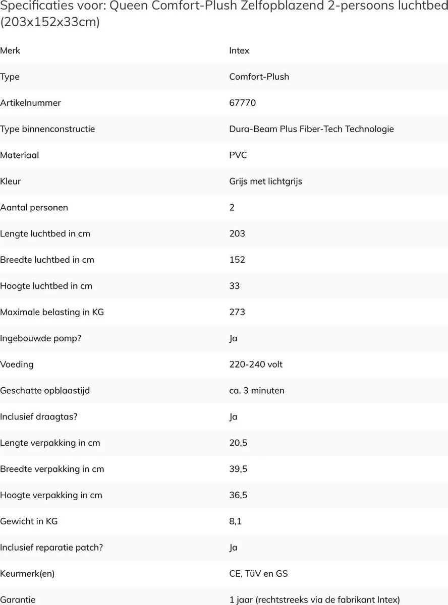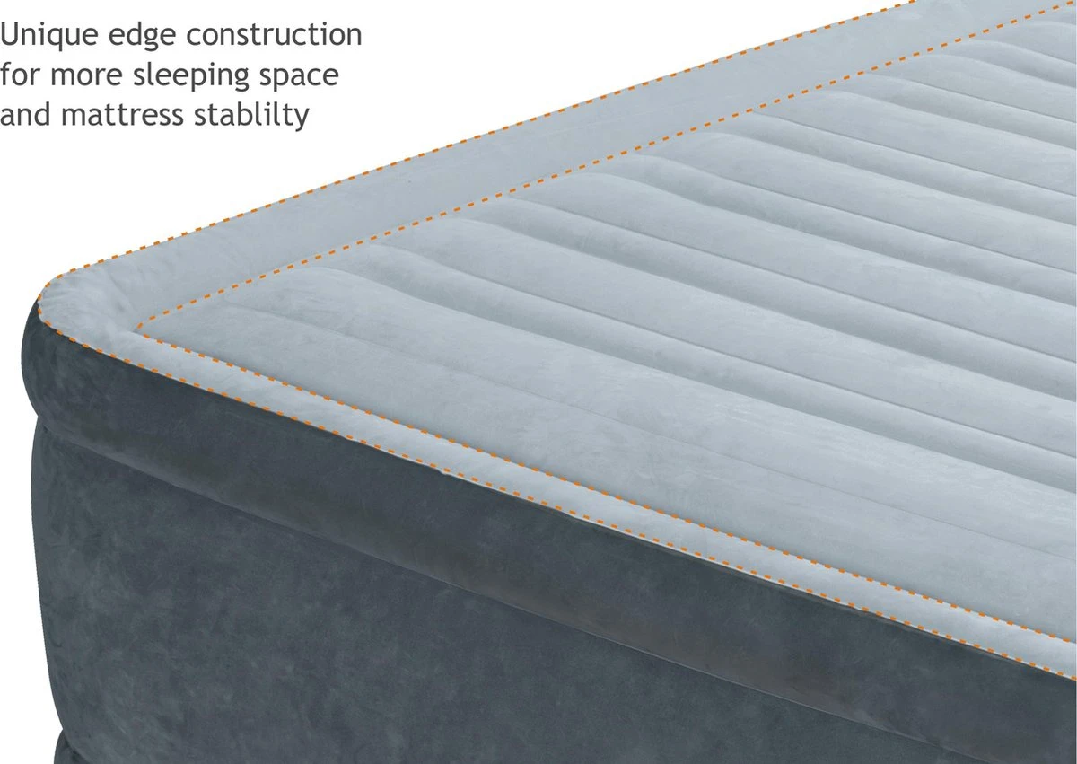 Het Intex Comfort-plush Full Luchtbed is een verlaagd, extra sterk en comfortabel luchtbed. Het luchtbed is voorzien van een duizenden sterke polyester vezels waardoor hij sterker en comfortabeler is dan normale PVC luchtbedden. Dankzij de ingebouwde pomp is hij snel opgeblazen waardoor het luchtbed geschikt is voor een logeerpartijtje of kampeervakantie.