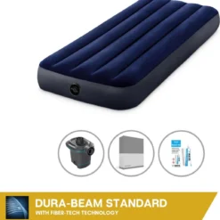 Het 1-persoons Intex Classic Downy luchtbed met afmeting 76x191x25 cm is geschikt voor thuis of op reis. De binnenkant van het luchtbed bevat polyester draadjes die van de boven- naar de onderkant van het luchtbed lopen. Deze duizenden vezels zorgen voor perfecte stabiliteit en een uitstekende ondersteuning van het lichaam. Deze binnenstructuur met ondersteunde Dura-Beam vezels, ook wel de Fiber-Tech technologie genoemd, is een uniek kenmerk van deze Intex luchtbedden en een garantie voor een comfortabele slaapervaring. Daarnaast is het luchtbed licht van gewicht, is deze compact en gemakkelijk op te vouwen en lig je dankzij het pluche slaapoppervlak heerlijk zacht. Via het extra grote 2-in-1 ventiel is het luchtbed snel op te blazen met een elektrische of hand- of voetpomp (niet meegeleverd). Zo creëer je in enkele minuten een fijne slaapplek op de camping, op je logeeradres of voor gasten die blijven slapen.
