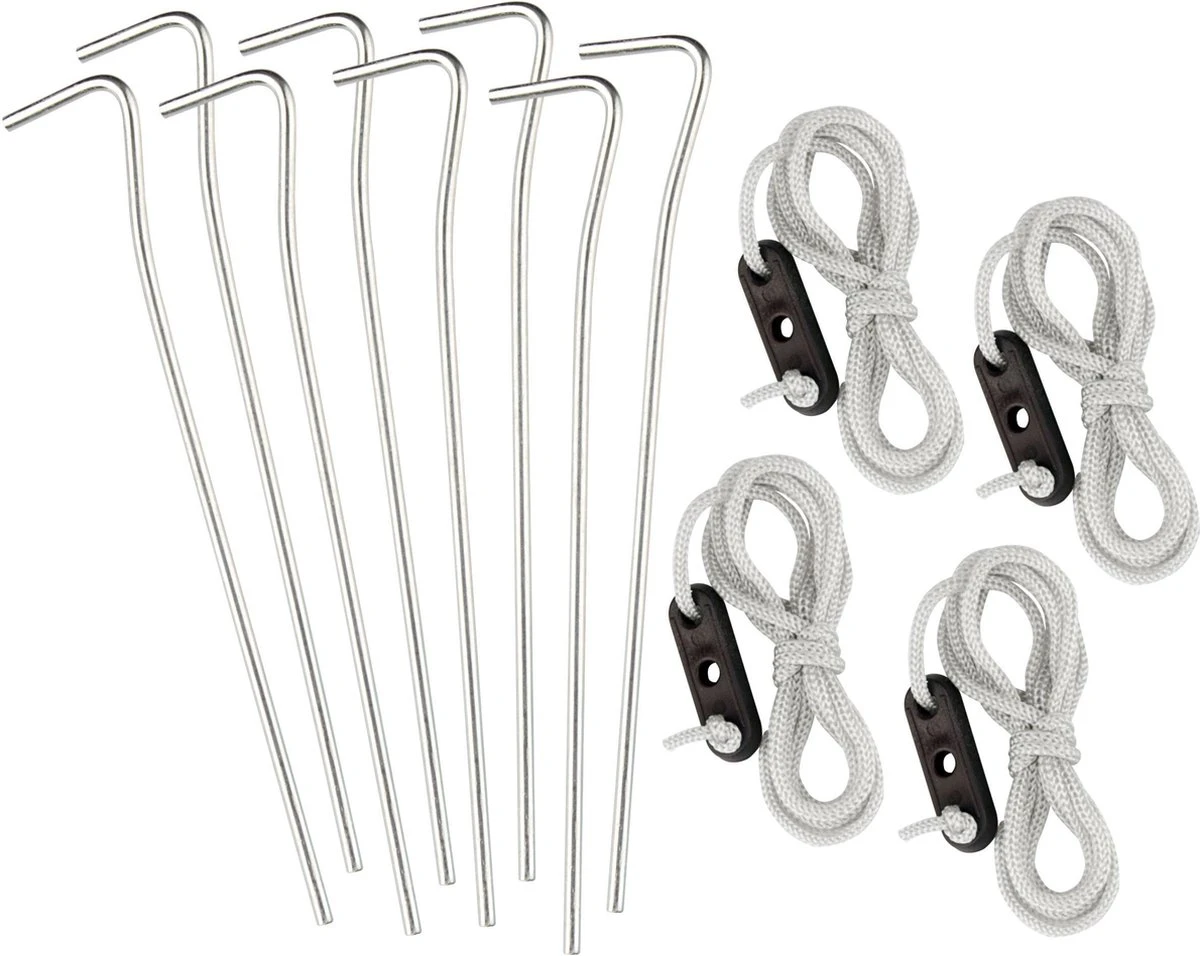 1 doek, 1 stok ø 7.9 mm, 2 stokken ø 7.0 mm, 8 haringen, 4 scheerlijnen, draagtas